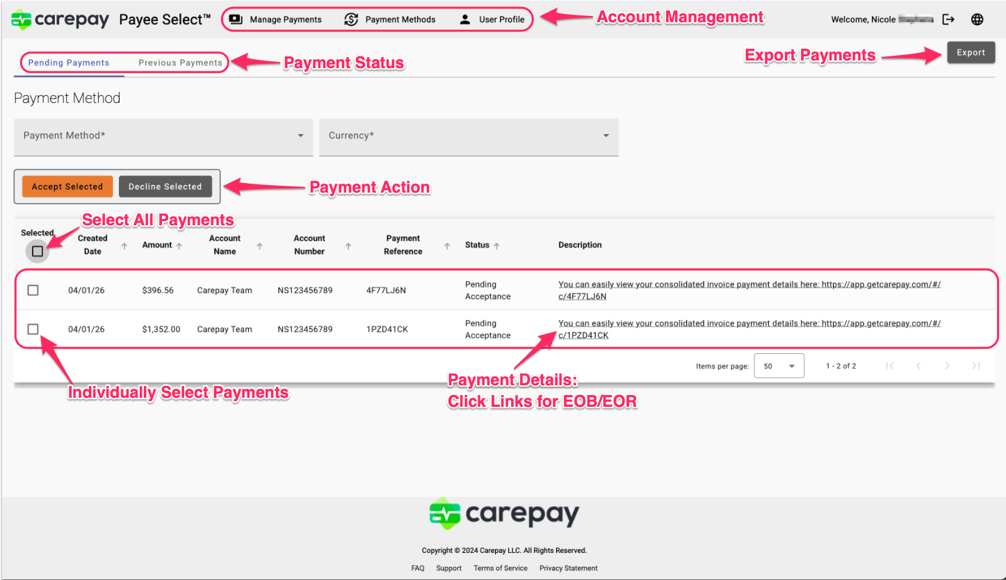 - New, unaccepted payments will appear in the “Pending Payments” section of your account