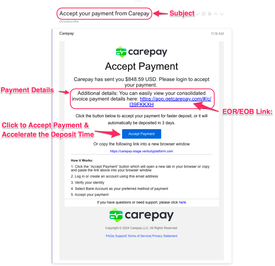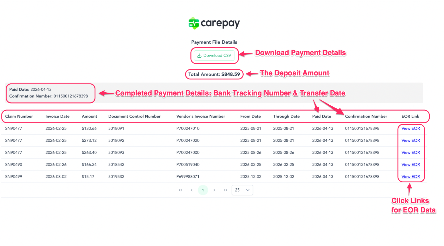 Reconciling your ACH/EFT payments with Carepay is designed to be simple and transparent. Every payment we issue includes the details you need to quickly match deposits to the corresponding invoices.