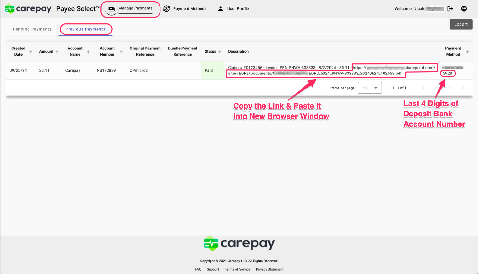- Use the payment notification email or portal history as your source of truth