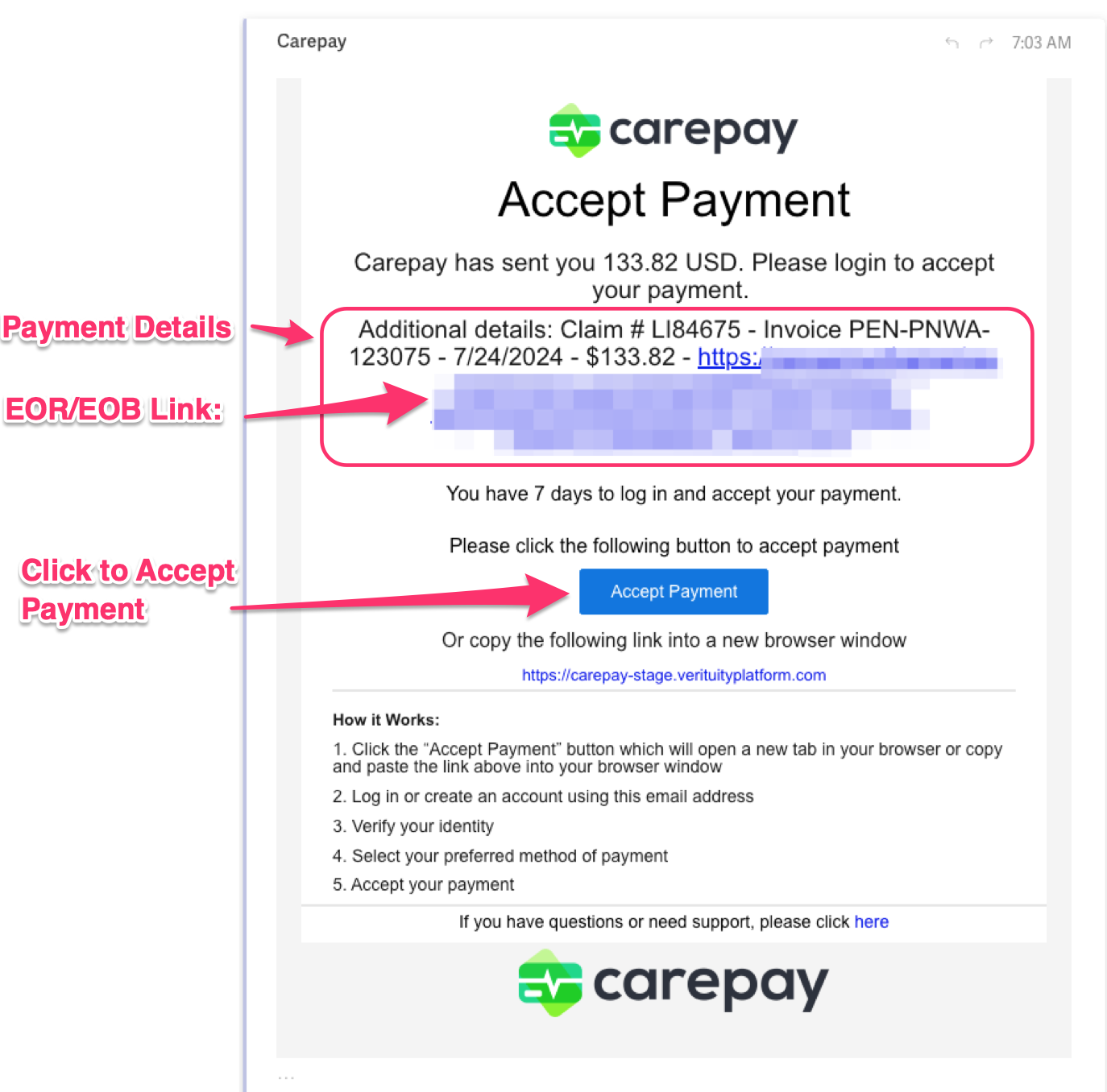 The email will also include a secure link for medical service providers to view the Explanation of Benefits (EOB) or Explanation of Review (EOR) corresponding to the payment.